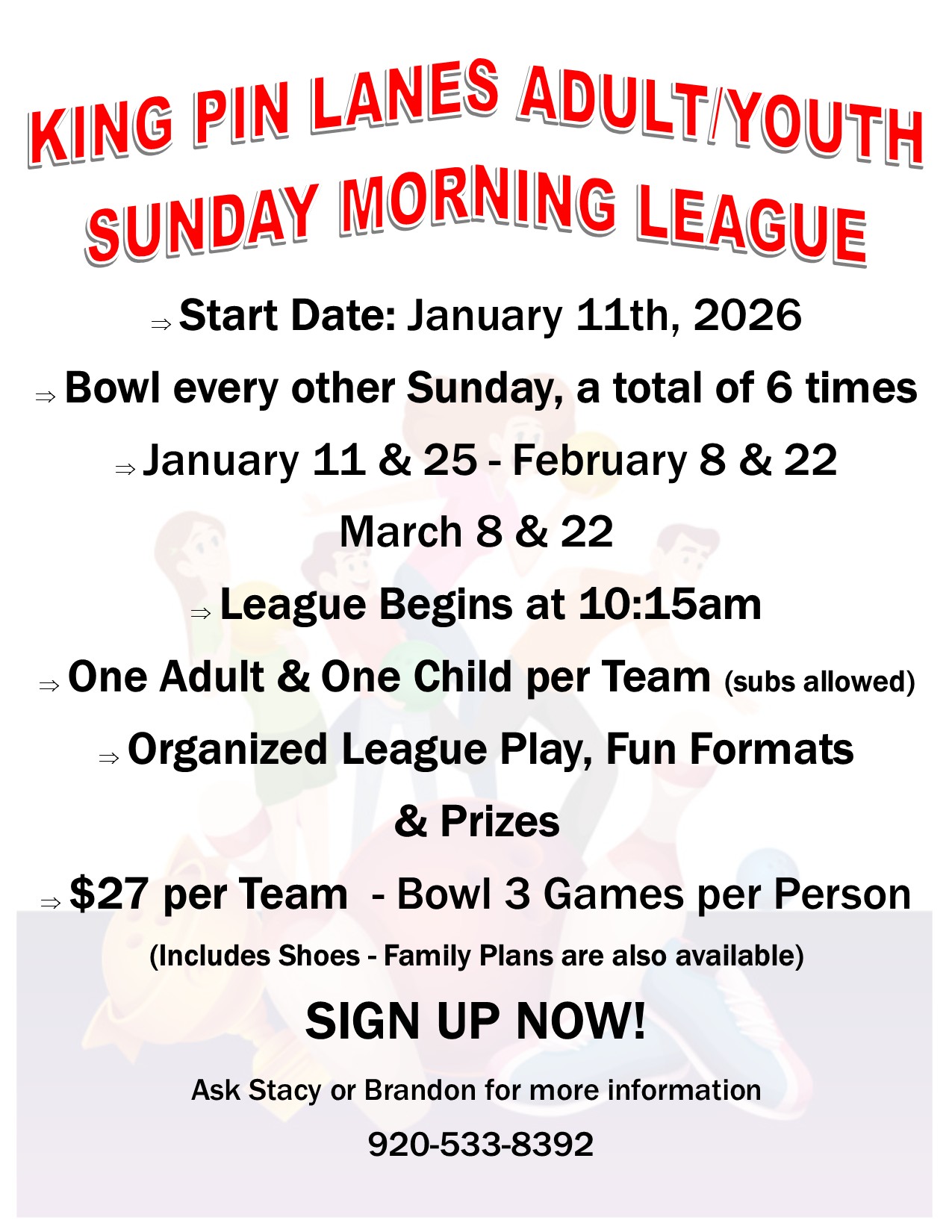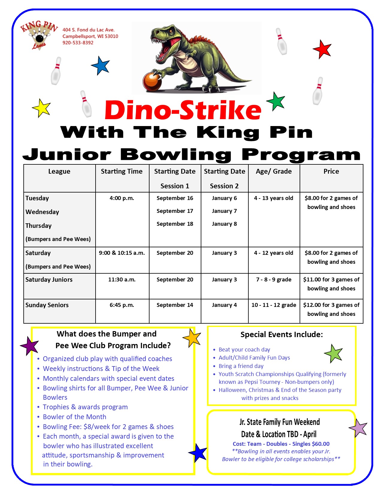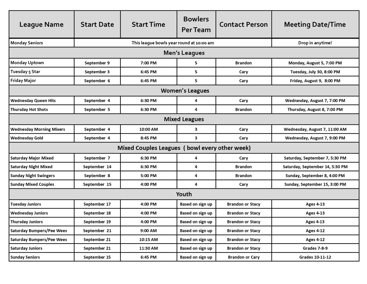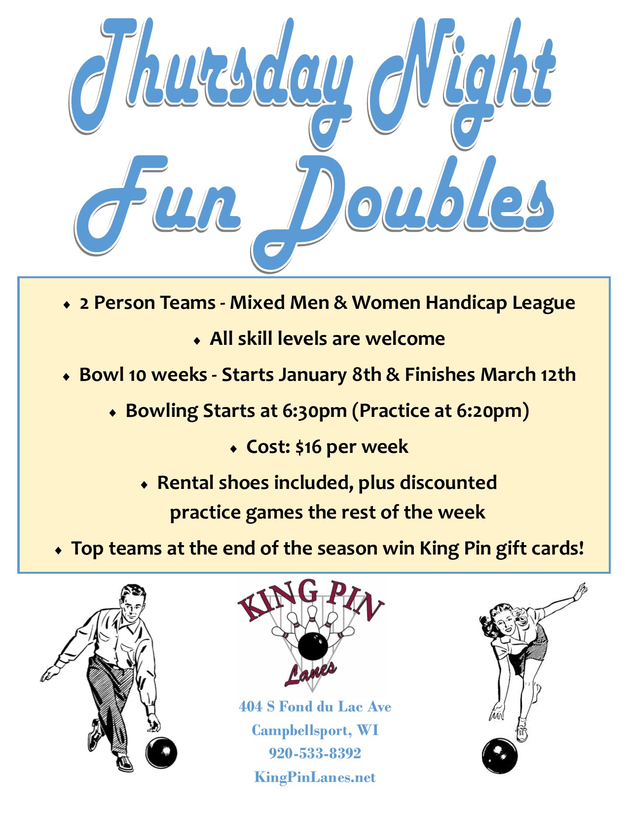 For full details on leagues listed below, download the King Pin Lanes fall league flyer.